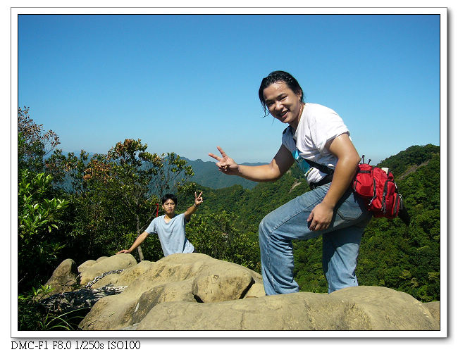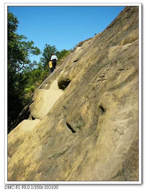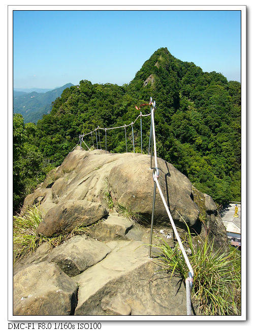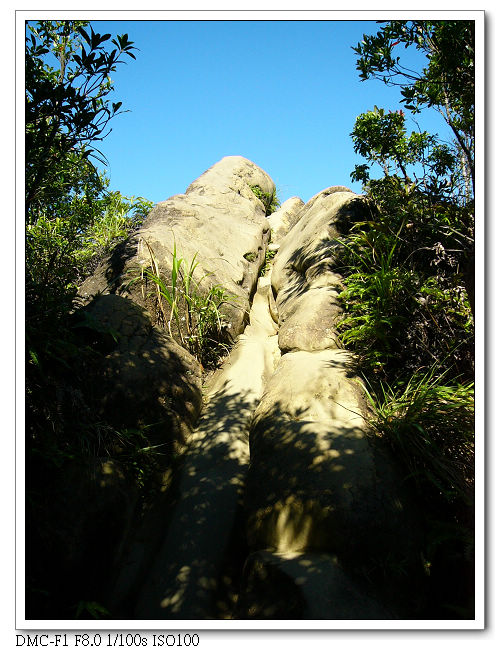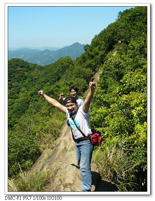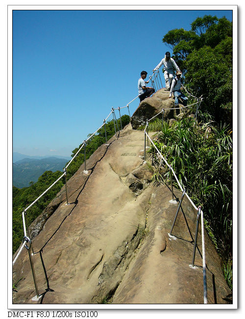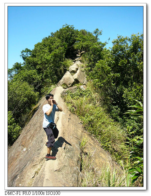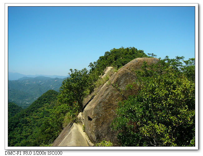 由於稜線為瘦脊,常須「騎馬狀」跨坐在岩壁上,再一屁股 、一屁股慢慢挪移過去,令人回味無窮。