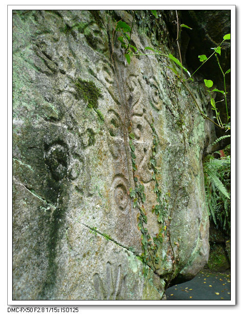 大石上,鑴刻了許多蛇紋、人形或同心圓,其來源和意義說法不一。