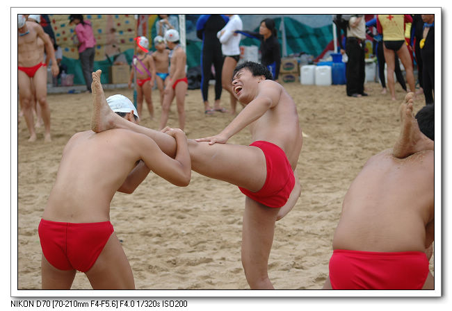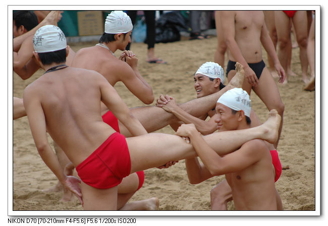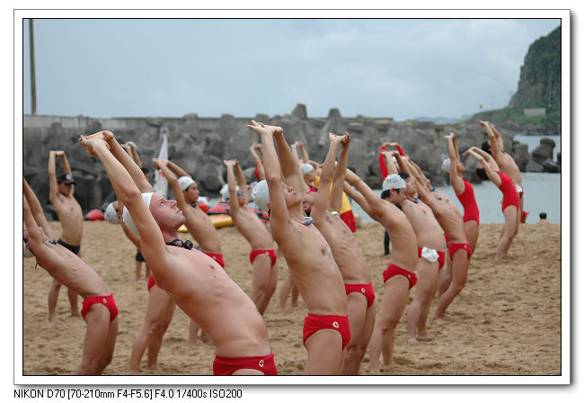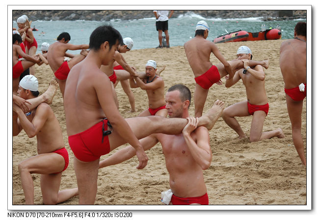 著裝開始做熱身運動下海。