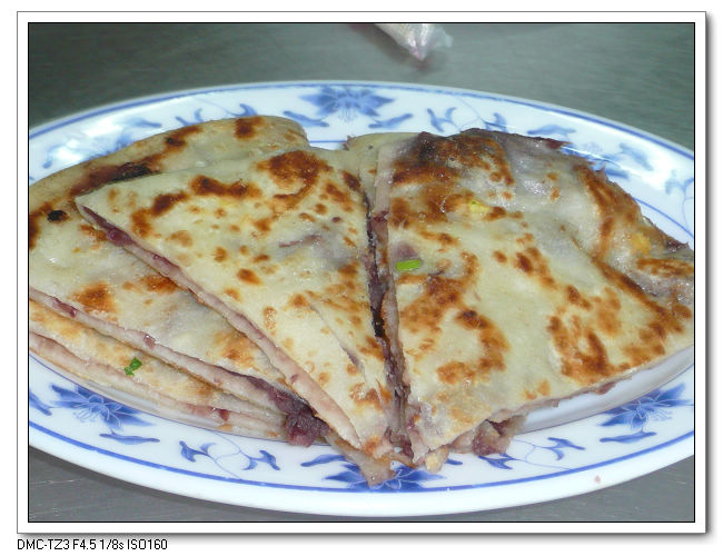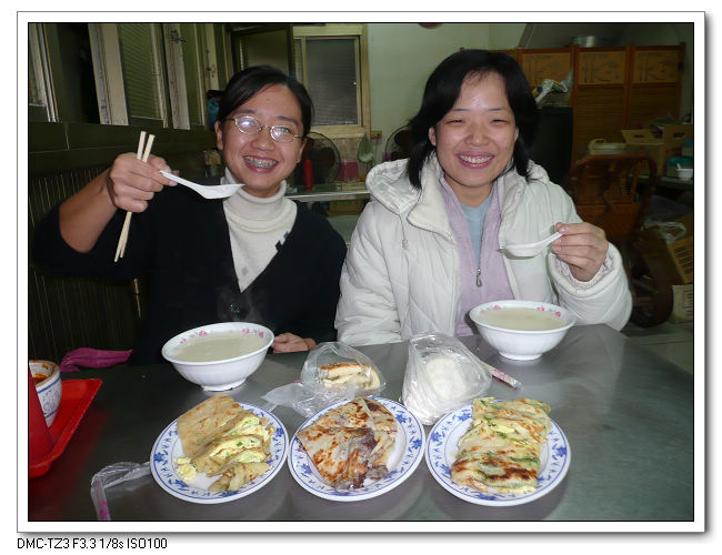 超豐盛的早餐,清漿、豆漿、蛋餅、紅豆餅、蔥油餅加蛋、蔥圈、飯團。
