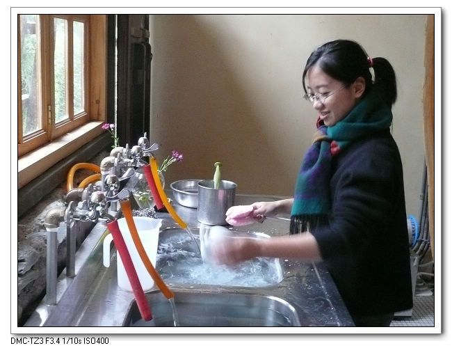 姿宇和嘉珍幫忙清洗碗盤,水好冰喔~