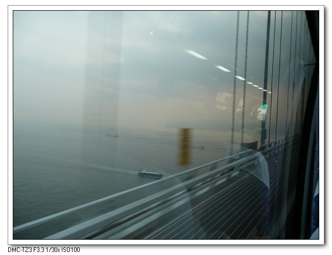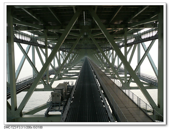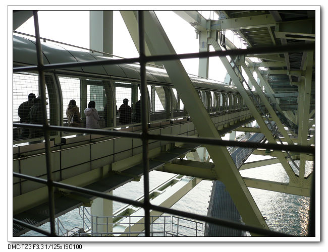 坐電梯直上八樓,到達橋底的海上遊步道參觀,觀看大橋複雜的結構。