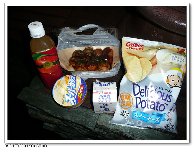夜拍時享受超市買的淡路島100%牛奶、明治冰淇淋、奶酪洋芋片、蘋果汁。