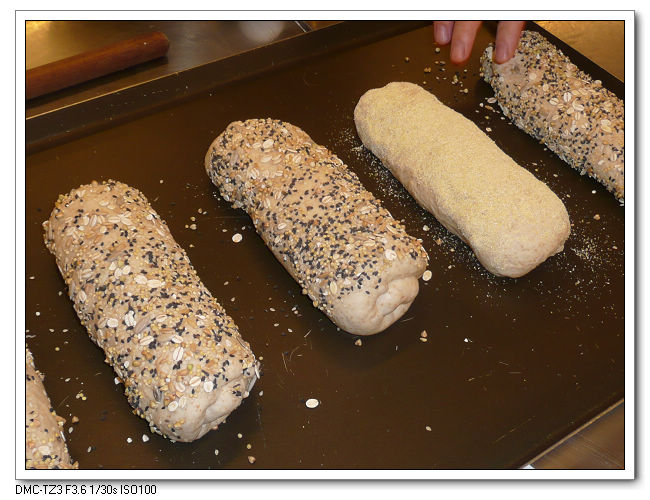 最後再沾五穀雜糧放到烤盤上,右邊的同學是沾玉米粉。