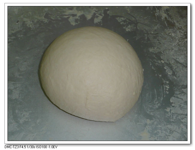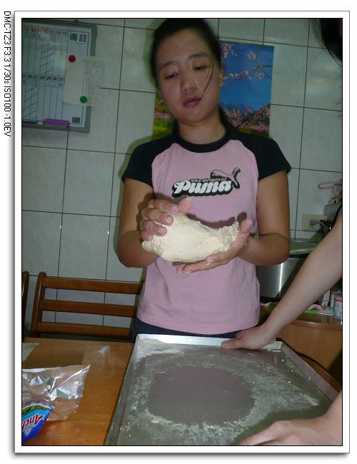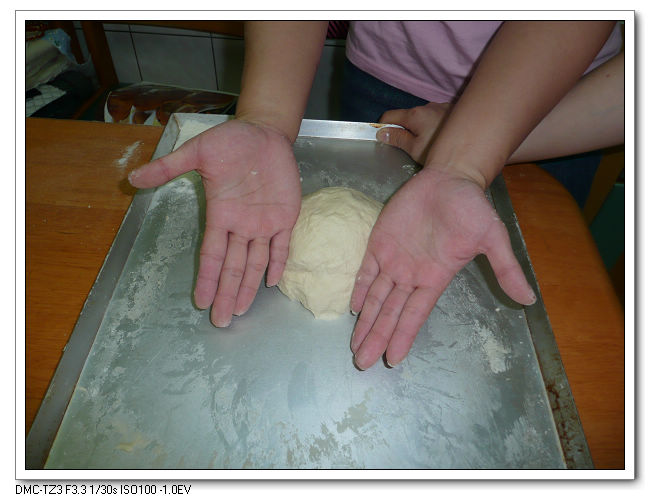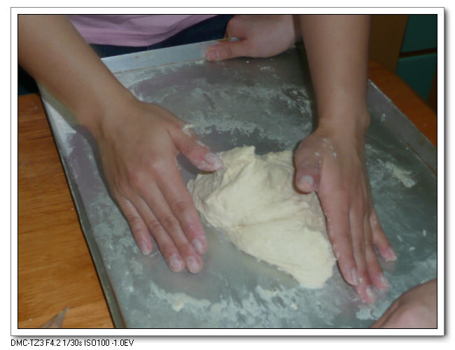 三人輪流努力揉麵團,奮鬥將近一小時,終於達到三光的境界。(盆光、手光、麵團光)