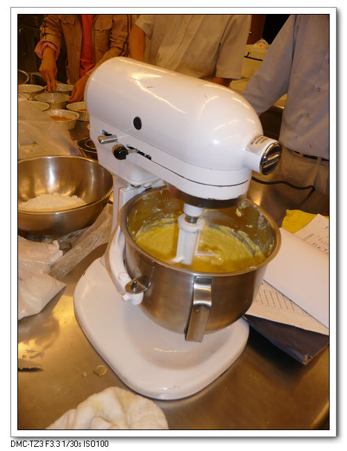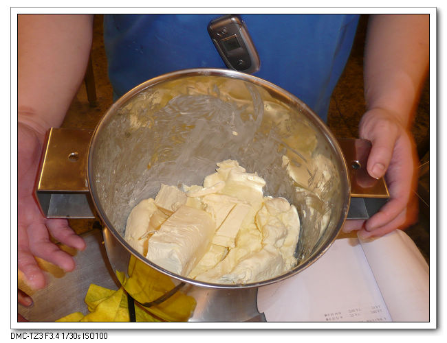 奶油乳酪、牛奶、蛋、糖材料放入攪伴桶準備攪勻。