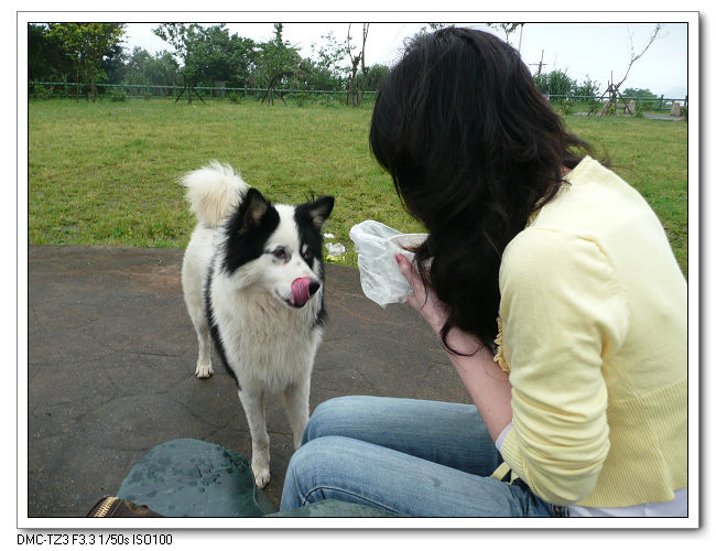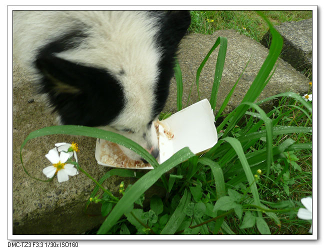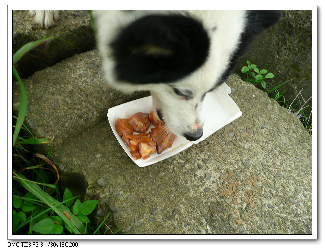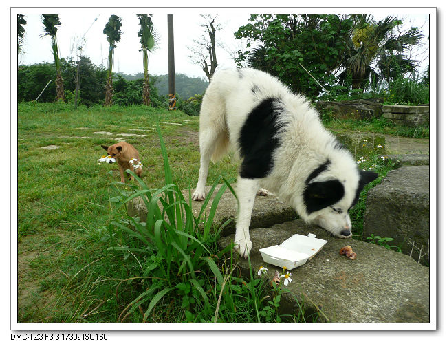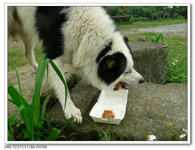 後來出現一隻小狗只能可憐的看著好料被吃完了。
