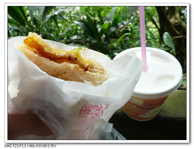 今日簡易早餐,雙溪車站前買的傳統蔥油餅加蛋&豆漿。