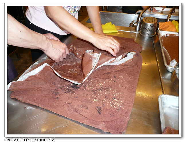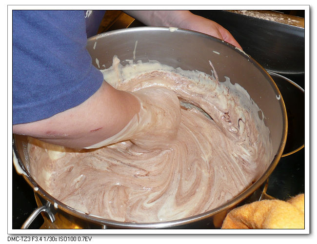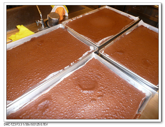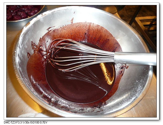 拌入巧克力漿,最後將巧克力麵糊倒入烤盤進烤箱。