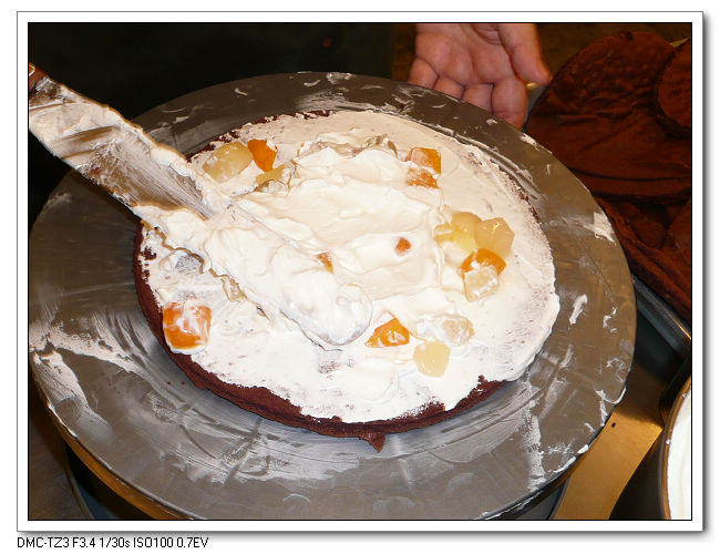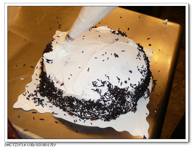 將整個蛋糕抹上鮮奶油後,外圍撒上一些巧克力米。