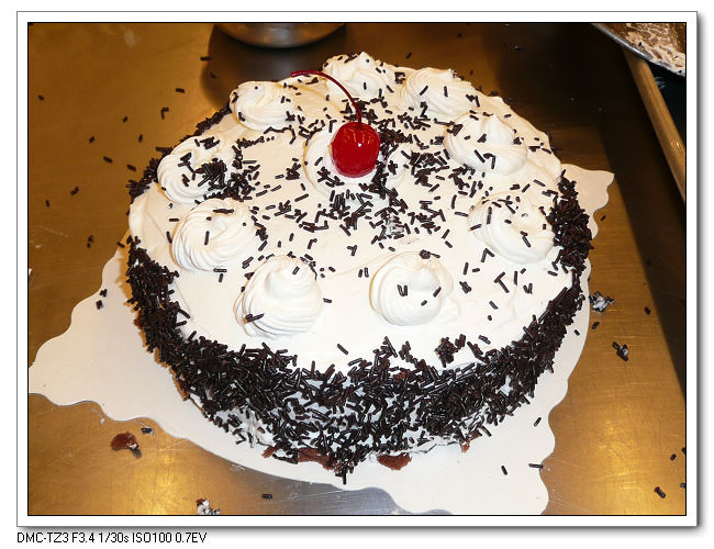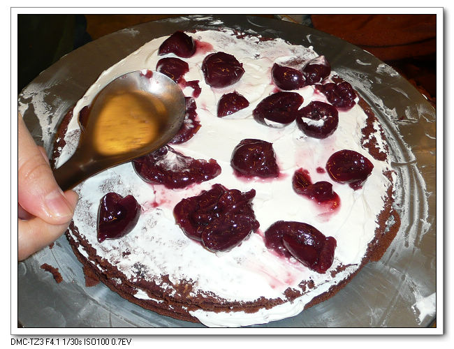 用擠花袋在蛋糕擠上鮮奶油裝飾,黑森林蛋糕完成~