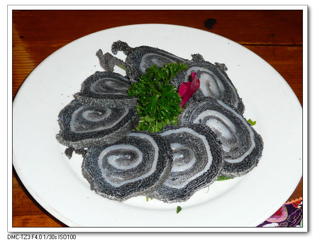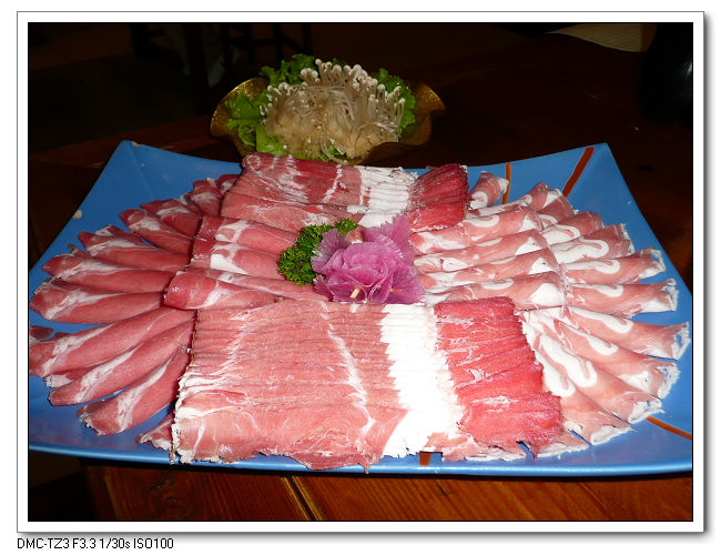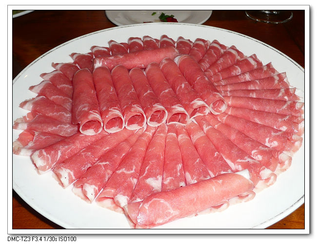 切出的羊肉片舒展開來,放在青花磁片上,透過肉片,青花花紋清晰可見。