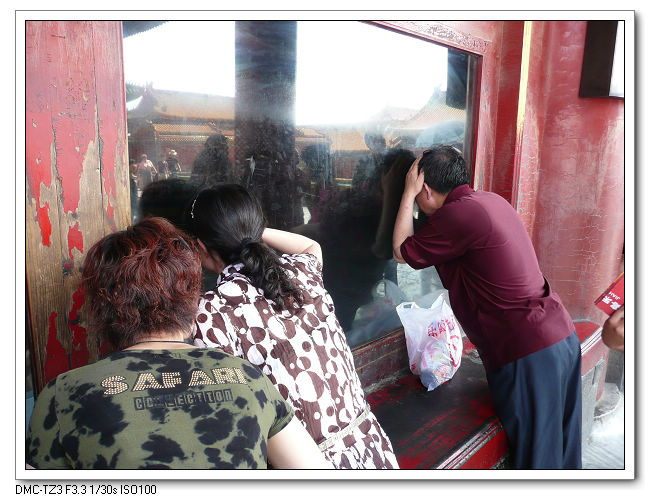 一群遊客趴在玻璃外一窺坤寧宮內的祕密。