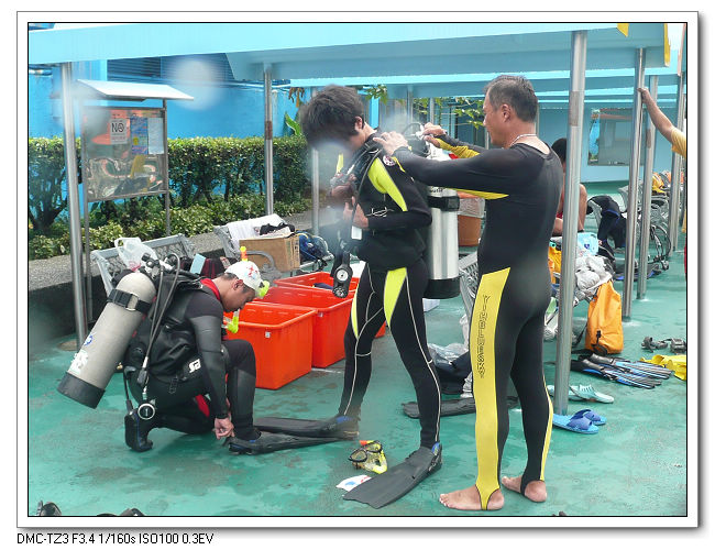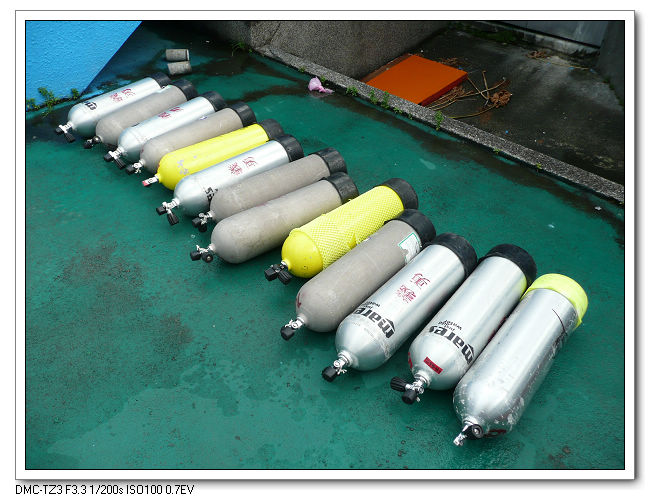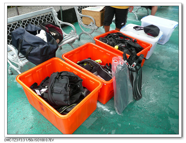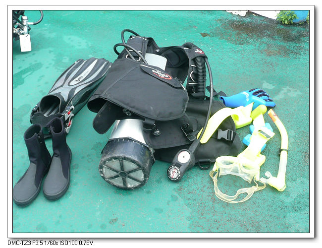 個人裝備:蛙鏡、呼吸管、BC(浮力衣)、氣瓶、調節器、潛水三用錶、鉛帶、手套、珊瑚鞋、蛙鞋。
