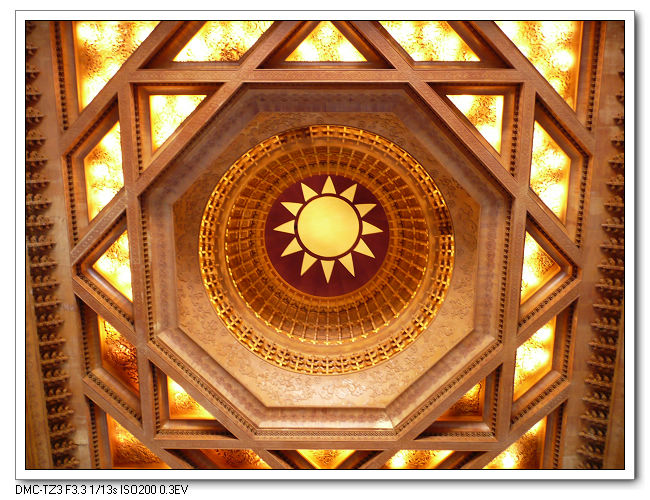 上方有大型藻井,為青天白日十二道光芒的國徽。