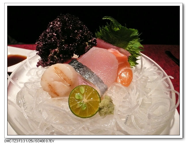 冷盤:四種生魚片(海鱱,鮭魚,鮪魚,鯕魚),現磨的芥末,金桔,日式醬油。